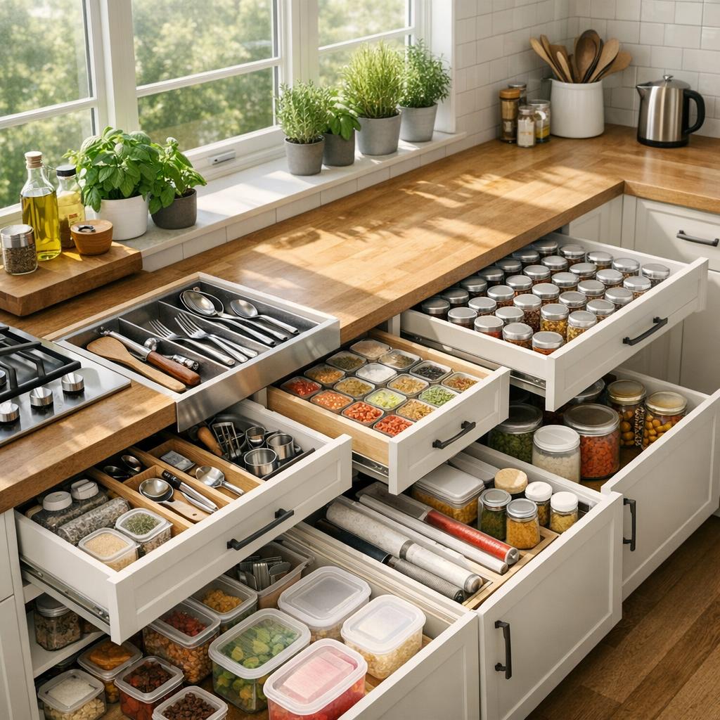Schubladen bieten viel Stauraum und sollten nach Funktion organisiert werden. Besteck, Kochutensilien und Küchenhelfer verdienen eigene Fächer. Teiler und Einsätze schaffen Ordnung und verhindern ein wildes Durcheinander. So bleibt alles griffbereit und übersichtlich.
